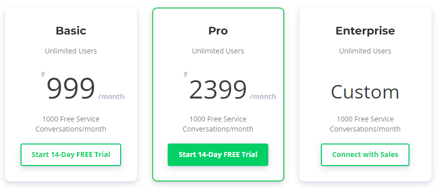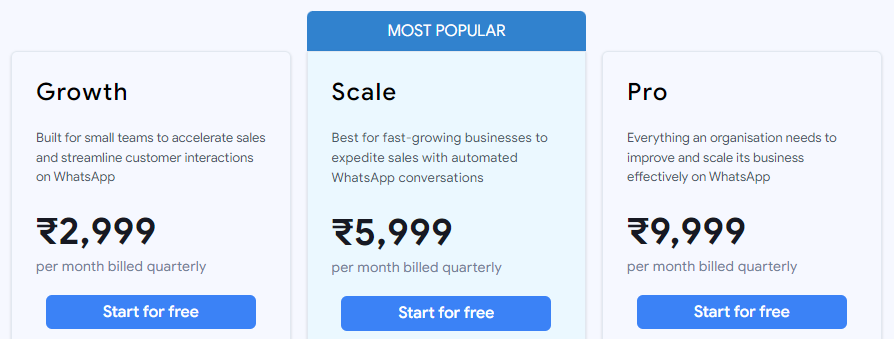 - AiSensy: AiSensy’s tiered pricing is designed for flexibility, but businesses should be aware of potential markup fees and additional charges based on feature usage and service levels.